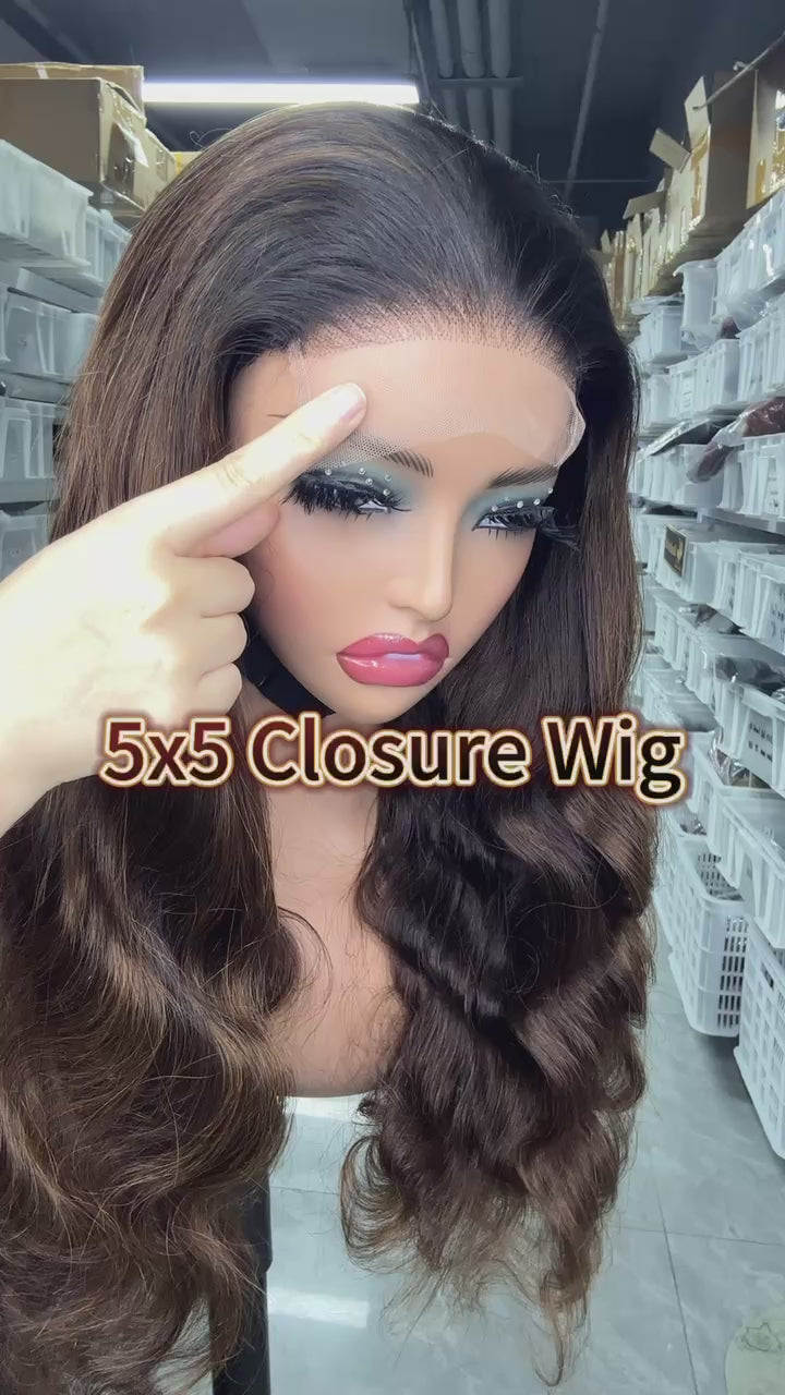 5x5 Transparent Lace Closure Glueless Wig Ombre Brown Color Body Wave Human Hair